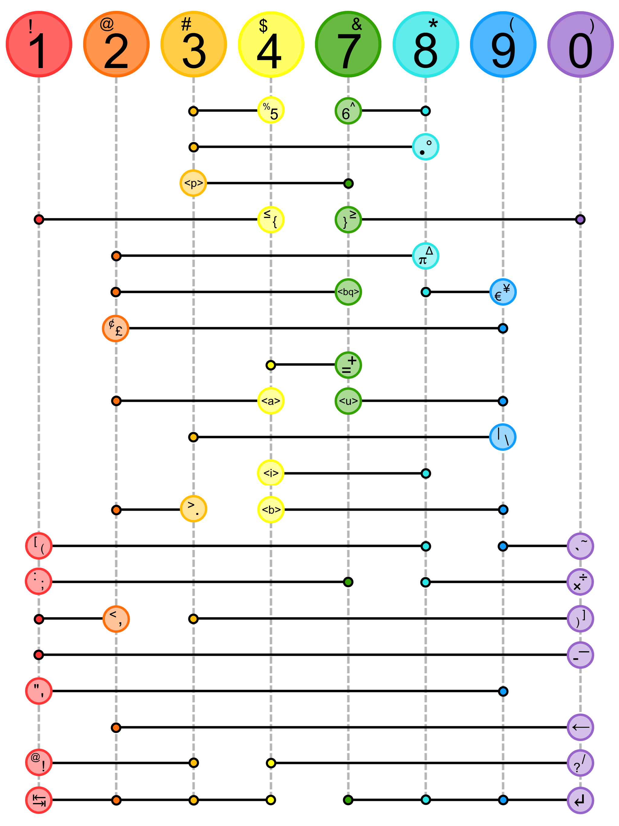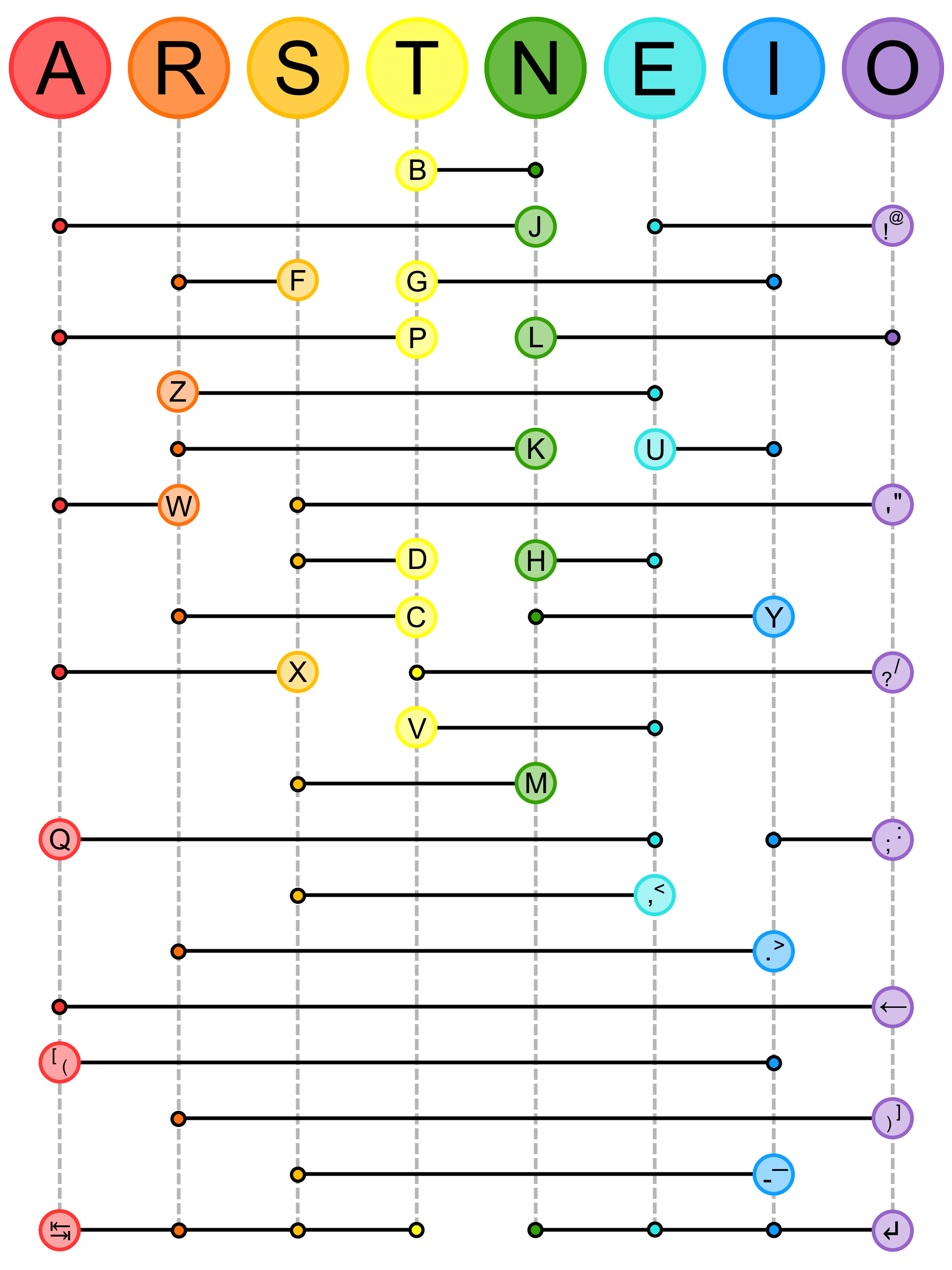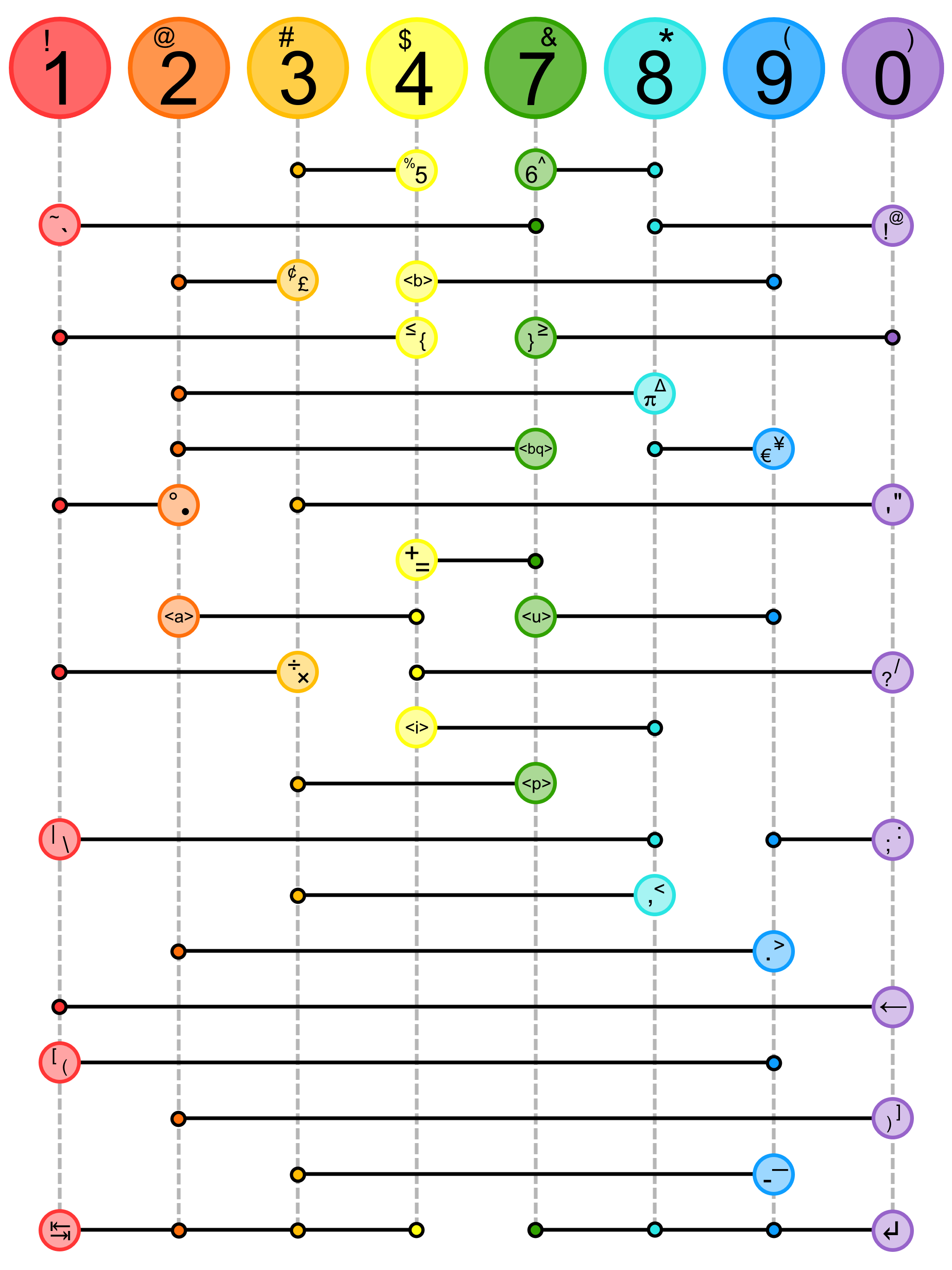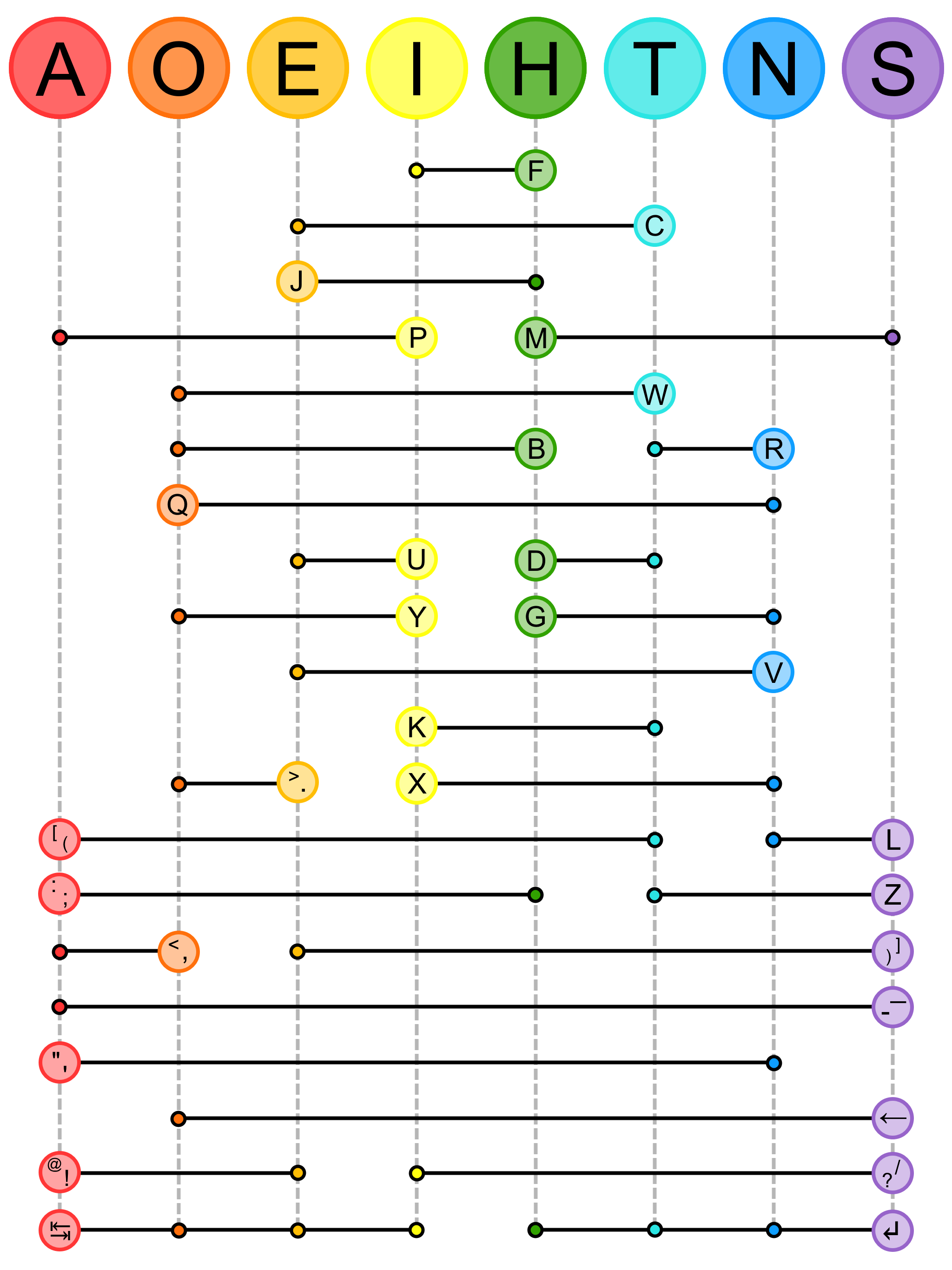 Top row letters ("home keys") are produced by a single press and release. All other letters, symbols, and function keys are formed by pressing the indicated combination.